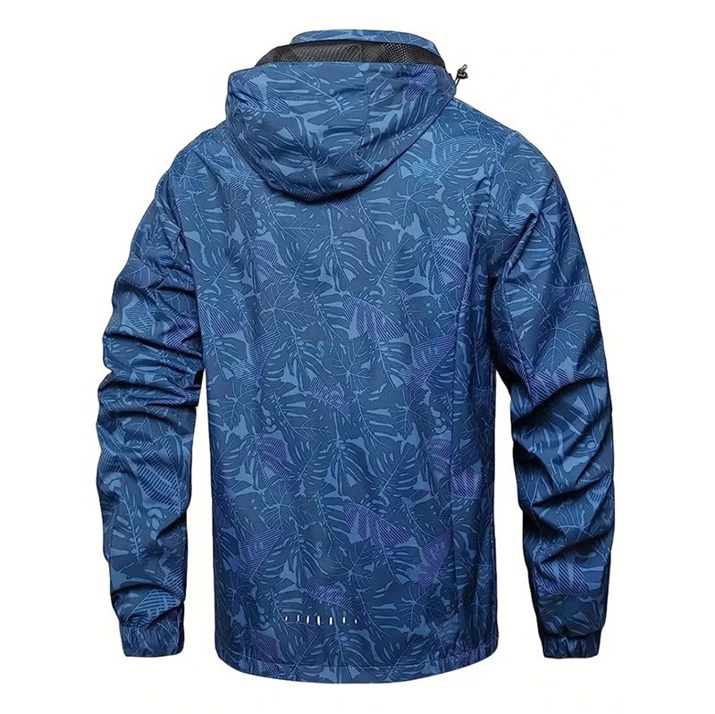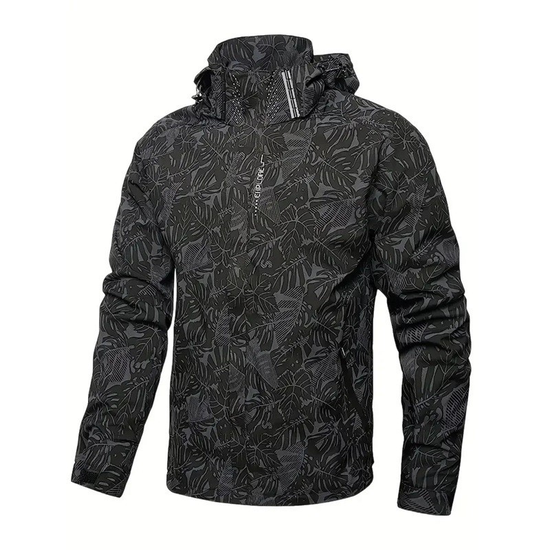 Jachetă bărbați casual impermeabilă cu glugă și fermoar, cu buzunare, motiv frunze, poliester