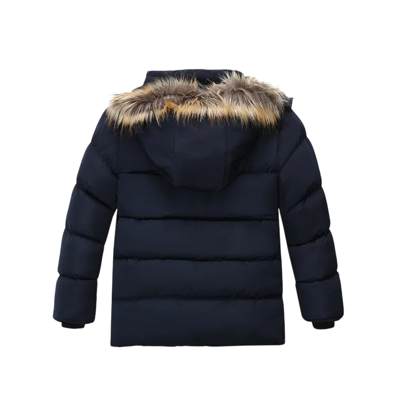 Jachetă călduroasă de iarnă pentru băieți cu glugă și blăniță, cu închidere confortabilă cu fermoar și capse. Ideală pentru vreme rece, plăcută și rezistentă. Descrierea completă