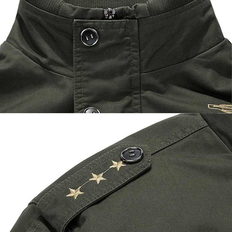 Jachetă de iarnă pentru bărbați cu guler și material rezistent la vânt. Material exterior din bumbac, închidere cu nasturi, căptușeală din poliester și buzunare practice. Descrierea completă