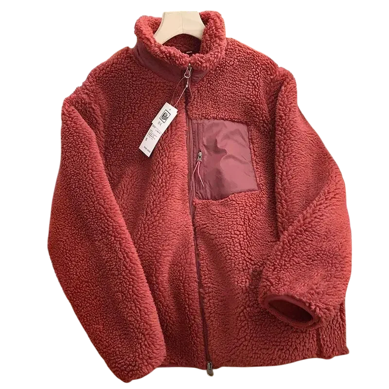 Jachetă de iarnă unisex din poliester plușat cu guler înalt, buzunare și buzunar cu închidere pe piept. Design călduros și confortabil, potrivit pentru purtarea zilnică în timpul iernii. Descrierea completă