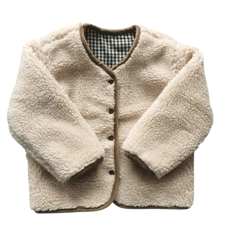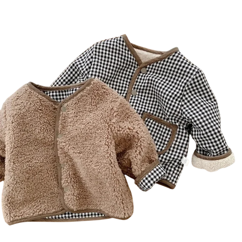 Jachetă de iarnă pentru copii reversibilă cu capse, buzunare, din material fâș cu o parte din blăniță, cealaltă parte în carouri, jachetă de iarnă din poliester cald