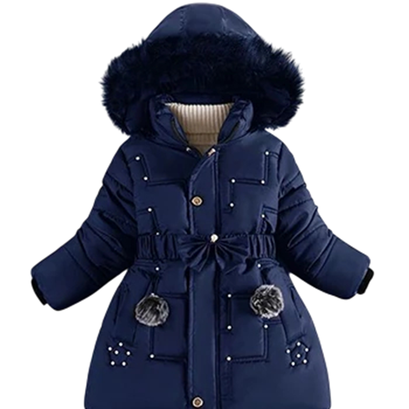 Jachetă de iarnă stilată pentru fete, cu glugă cu blăniță, buzunare cu pompoane și închidere dublă. Bumbacul și poliesterul călduros asigură confort chiar și în vreme rece. Descrierea completă