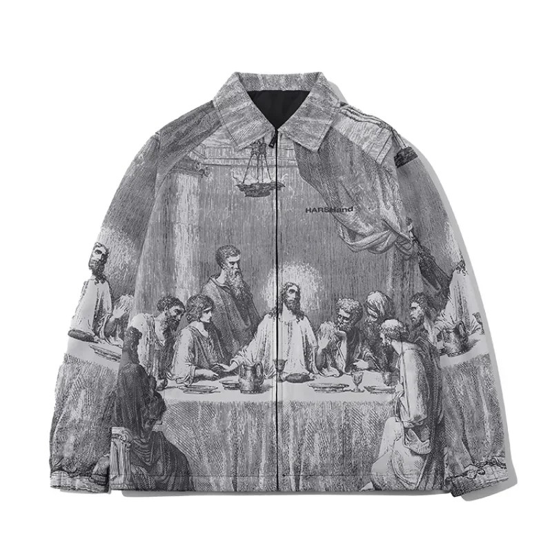 Jachetă de toamnă pentru bărbați gri cu motivul picturii Cina cea de Taină cu fermoar și guler unisex pentru femei și bărbați POLIESTER