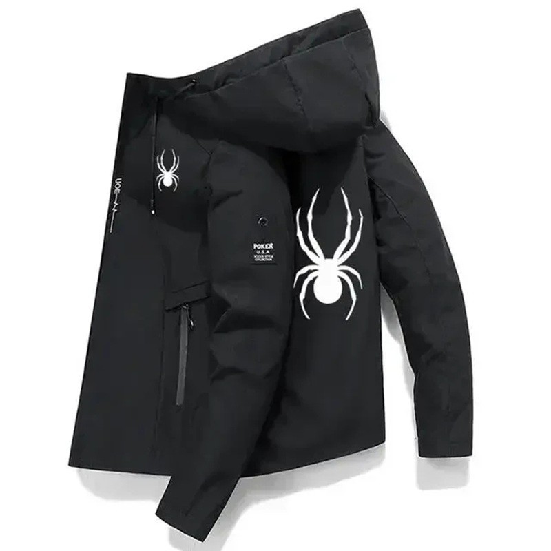 Jachetă sportivă bărbați rezistentă la vânt cu glugă și motiv de păianjen, O-gât, cu fermoar, buzunare, POLIESTER de înaltă calitate, disponibilă în diverse culori, ideală pentru sport și activități în aer liber. Descrierea completă