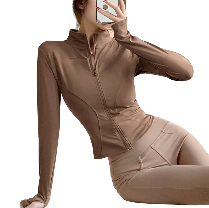 Jachetă sportivă ajustată pentru femei cu deschideri pentru degete, ideală pentru antrenamente și purtare zilnică. Material rapid uscare și confortabil. Descrierea completă