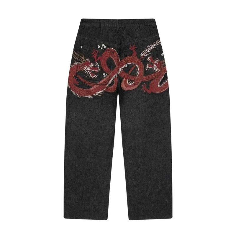 Jeans bărbați negri cu imprimeu de dragoni pe buzunarele din spate, talie joasă, croială largă și buzunare practice. Fabricat din denim de calitate, ideal pentru purtare zilnică. Descrierea completă