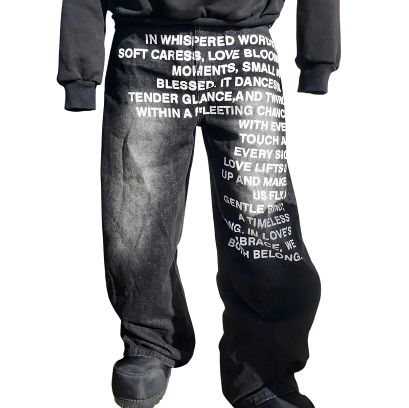 Jeans bărbați uni cu inscripții, cu buzunare, talie joasă, largi, croi confortabil pentru purtare zilnică