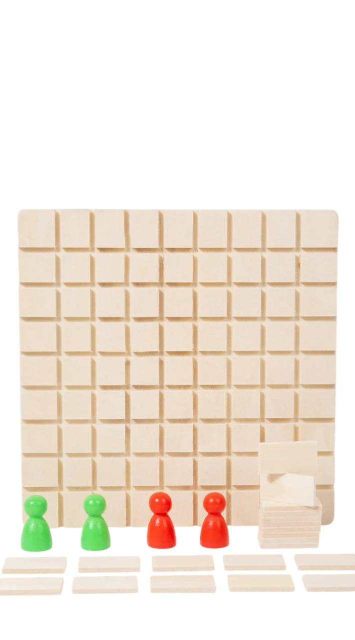 Jocul de societate Quoridor cu 81 cuburi, 4 figurine, 4 capcane și 20 de pereți. Dimensiuni 22 x 22 cm. Un joc logic excelent pentru copii și adulți. Descrierea completă