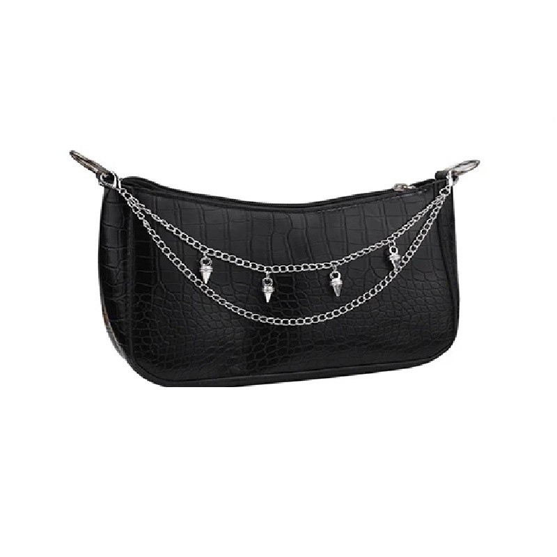 Întregul accesoriu este fabricat din aliaj metalic, care formează linkurile lanțului și pandantivele decorative. Suprafața lanțului are culoare argintie, care se poate asorta bine cu diverse tipuri de genți și accesorii de modă. Părțile metalice sunt conectate prin linkuri ale lanțului, care permit suspendarea naturală a lanțului pe geantă.