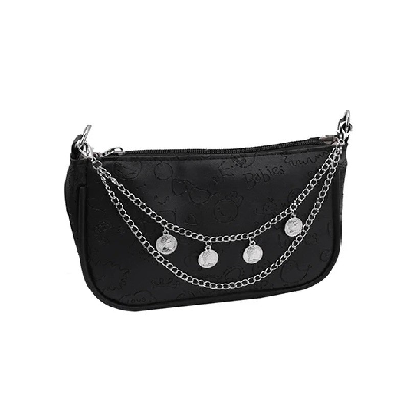 Lanțul dublu poate reprezenta o modalitate simplă de a completa geanta cu un nou element decorativ. Pandantivele în formă de monede creează un detaliu expresiv care poate revitaliza aspectul genții. Culoarea argintie se poate combina bine cu diferite stiluri de genți. Datorită carabinelor de la ambele capete, lanțul poate fi atașat cu ușurință și, dacă este necesar, de asemenea, îndepărtat rapid.