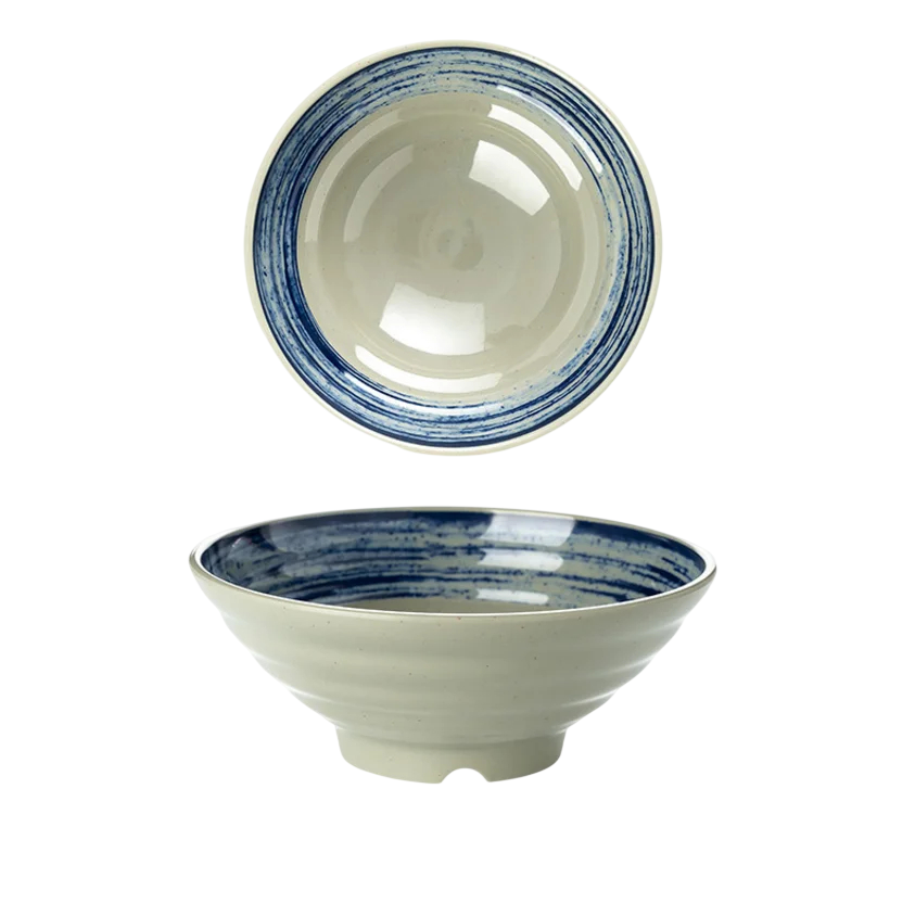 Mască din porțelan japonez 1000 ml cu suprafață crem și margine albastră în dungi este ideală pentru supe de tăiței și alte preparate. Descrierea completă