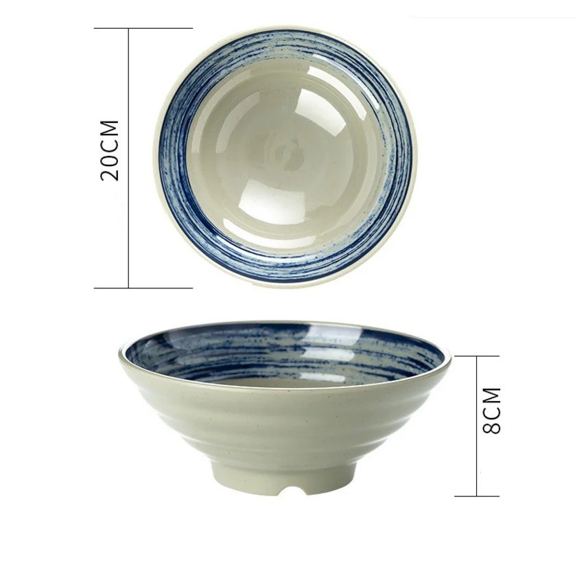 Pagina de start Pagina de start Casă Bucătărie Servirea mesei Boluri și Recipiente Mască din porțelan în stil japonez 1000 ml cu fund crem și margine albastră în dungi 20 x 8 cm pentru supă de tăiței