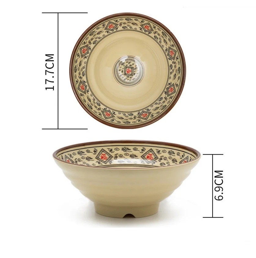 Mască este fabricată din porțelan, care este utilizat frecvent pentru vesela de masă. Capacitatea de 600 ml permite servirea confortabilă a supelor și tăițeilor. Dimensiunile 17,7 x 6,9 cm asigură stabilitate și manipulare ușoară. Suprafața în culoare bej cu model ornamental negru-roșu corespunde aspectului din imagine. Construcția este potrivită pentru servirea supelor de tăiței și altor preparate.