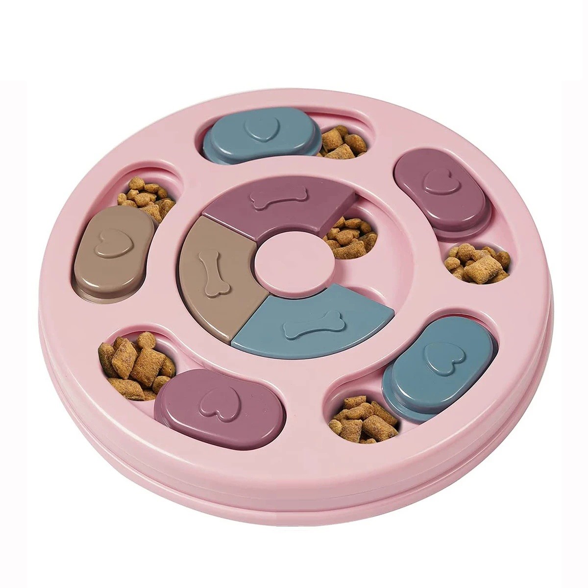 Mască interactivă circulară cu piese mobile pentru ascunderea deliciilor susține hrănirea lentă, îmbunătățește IQ-ul și previne plictiseala animalelor de companie. Descrierea completă