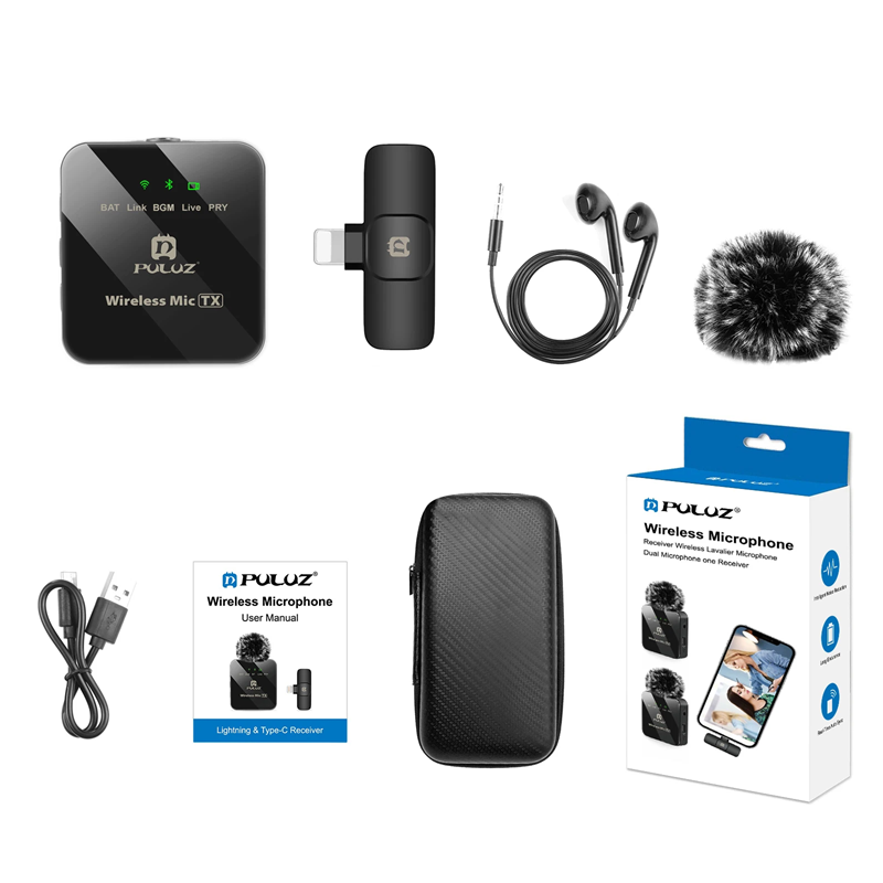 • Conținutul pachetului: microfon lavalier, receptor USB Lightning, protecție împotriva vântului, căști, cablu de alimentare, husă.