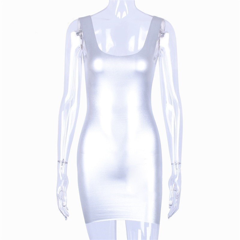 Rochie de petrecere sexy pe umerase din material elastic strălucitor.