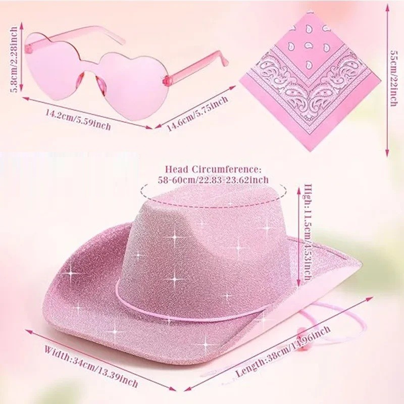 Această set de accesorii stilat este alegerea ideală pentru mireasa care dorește să strălucească cu adevărat la petrecerea ei înainte de nuntă. Pălăria roz strălucitoare de cowboy, ochelarii expresivi în formă de inimă și eșarfa asortată creează o ținută jucăușă și totodată imposibil de trecut cu vederea. Se potrivește perfect pentru o petrecere tematică, o seară de distracție cu prietenele, o sesiune foto sau ca un accesoriu distractiv pentru un costum original.