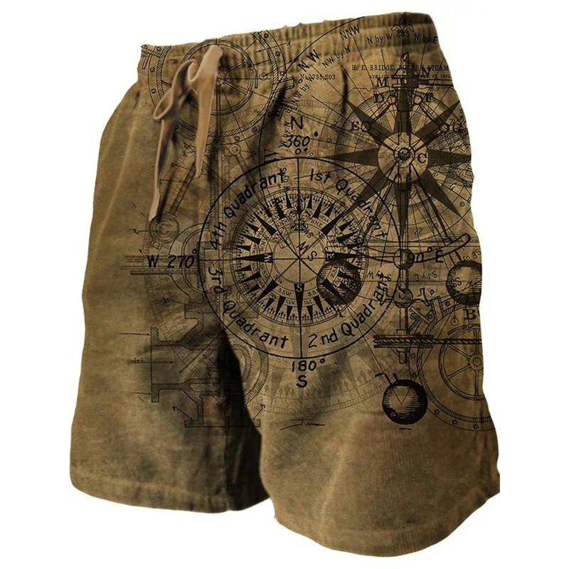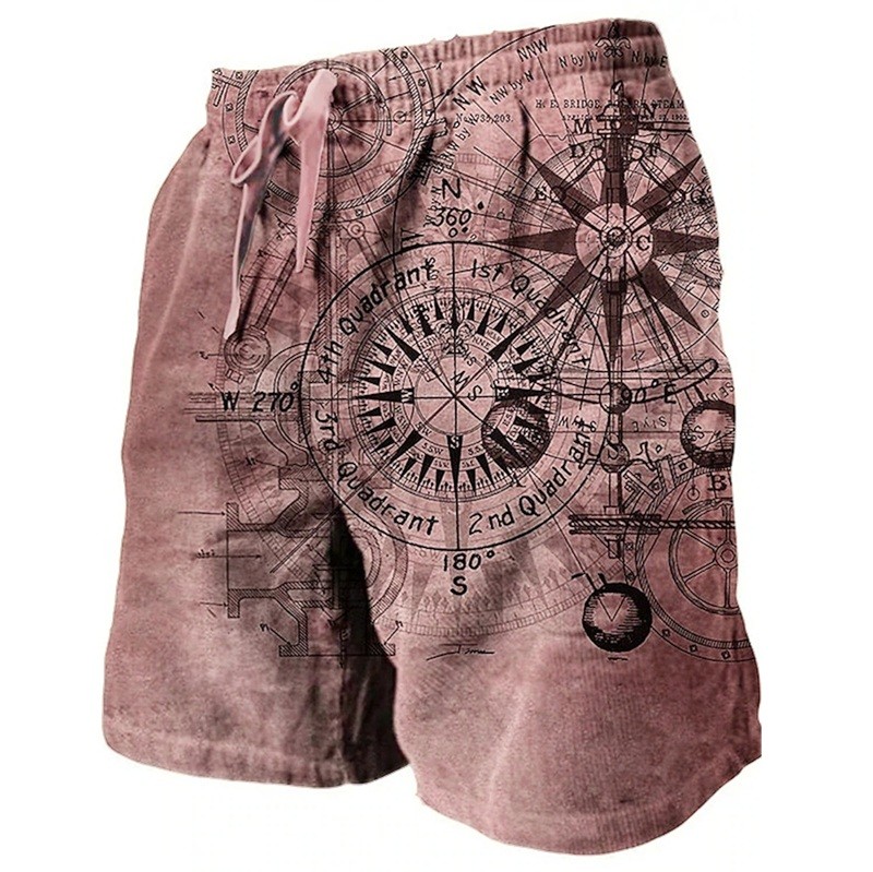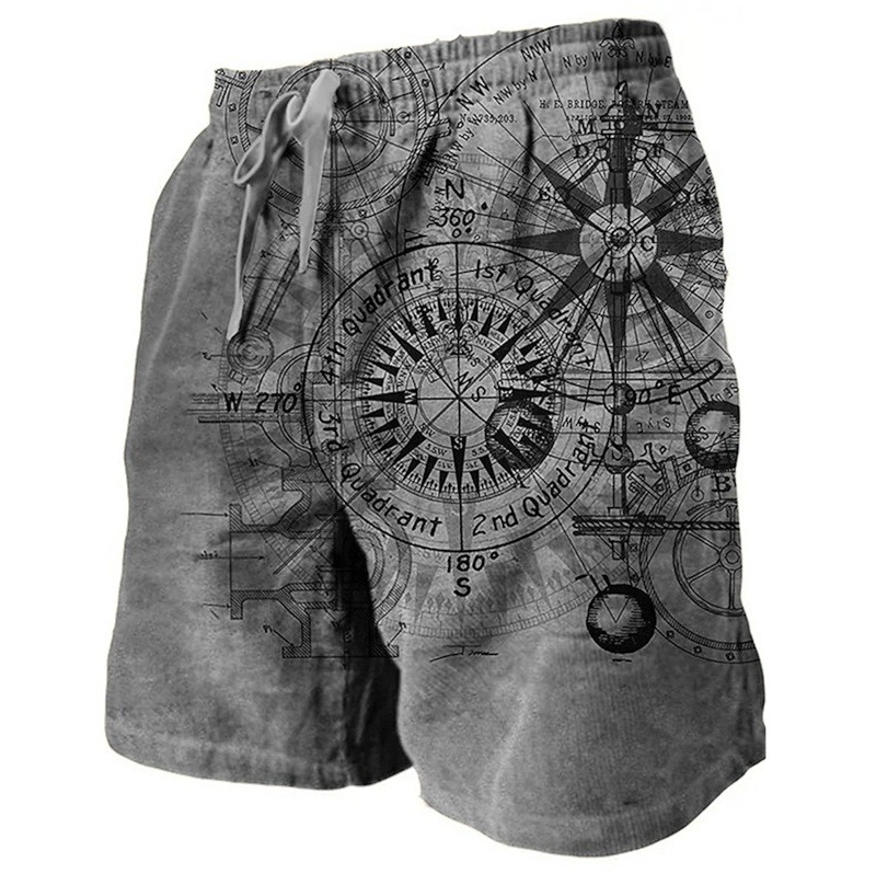 Pantaloni scurți de baie pentru bărbați din poliester, uni, cu motiv de busole, cu șnur și buzunare, pentru plajă și piscină