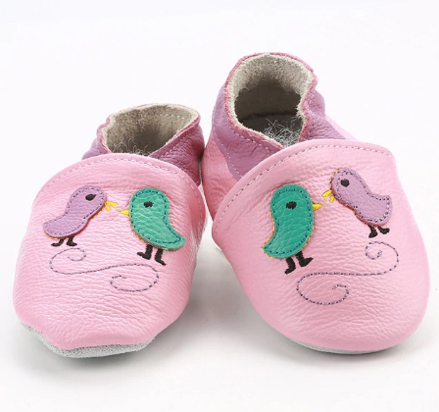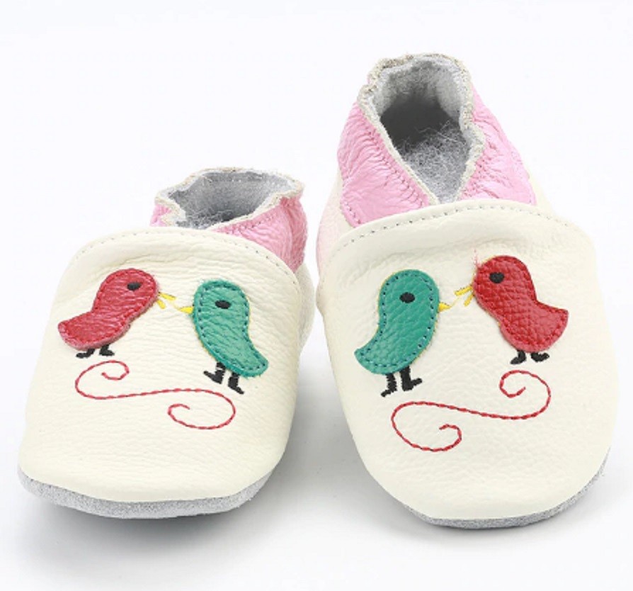 Papucii pentru copii cu păsări sunt confecționați din piele de calitate și moale.