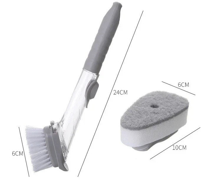 Perie pentru vase 2 în 1 24 x 6 cm Rezervor pentru detergent Burete interschimbabil 10 x 6 cm Perii din PET Perie de curățare pentru bucătărie Peria practică pentru vase 2 în 1 este ajutorul ideal pentru spălarea zilnică a farfuriilor, cratițelor și tigaielor. Datorită lungimii