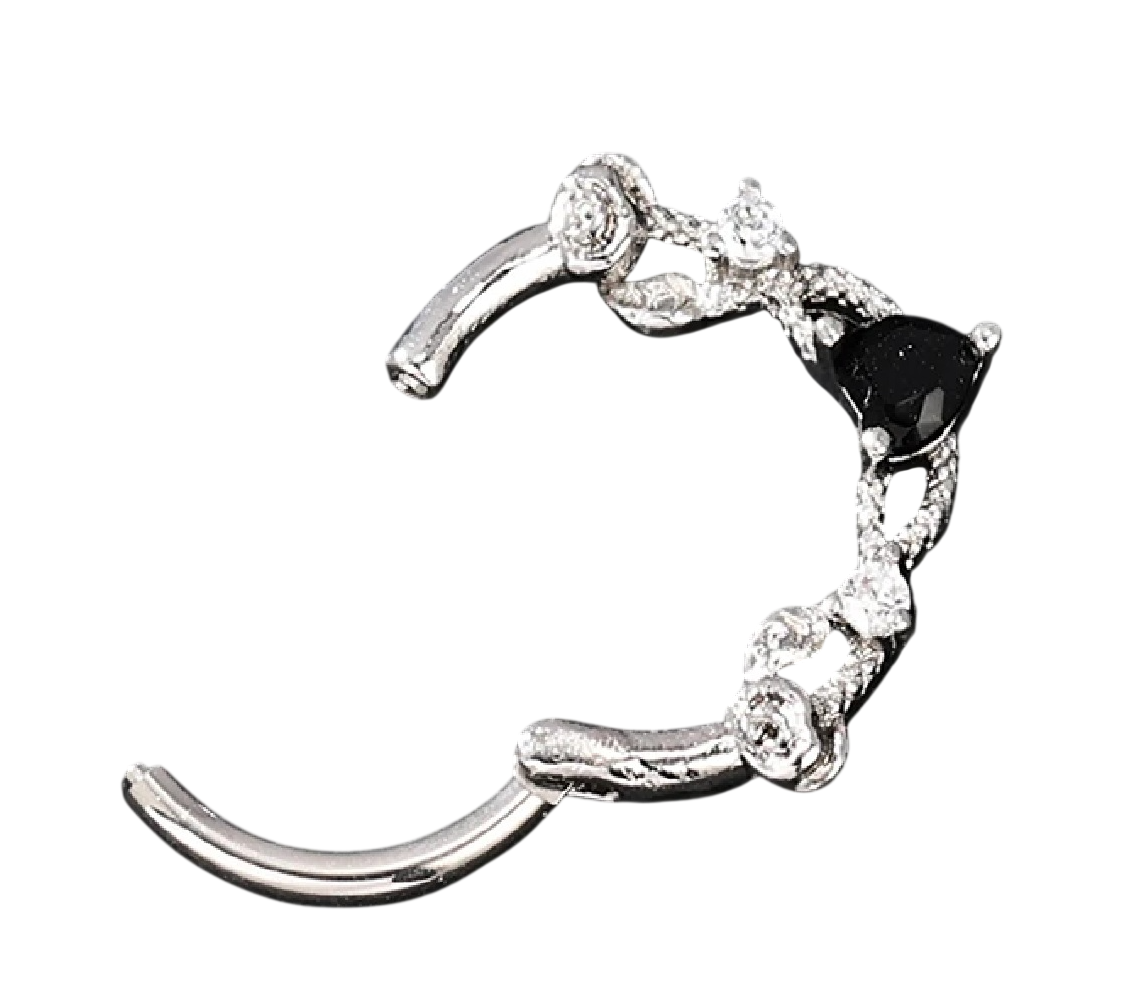 Piercing rotund cu inimă neagră și detalii argintii oferă un contrast puternic și un aspect elegant, potrivit pentru purtare zilnică. Descrierea completă