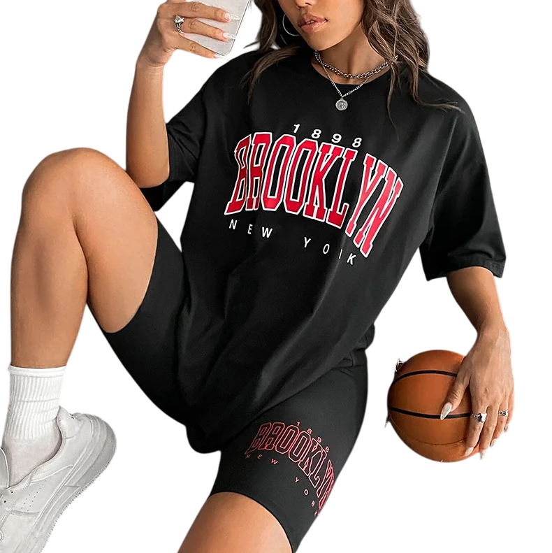 Pijamale de vară pentru femei cu mânecă scurtă și pantaloni scurți Compleu uni cu inscripția Brooklyn din poliester și spandex în diferite culori