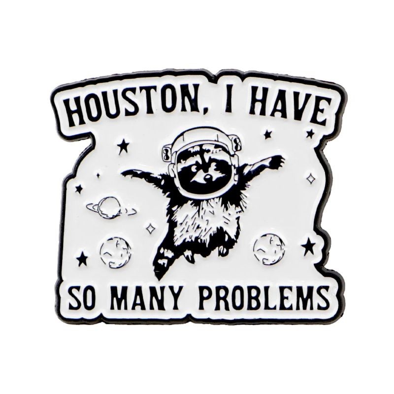 Pinul emailat cu motivul raccoon-ului în stil de astronaut aduce o combinație interesantă între un motiv animal și un temă cosmică. Elementul dominant este figura desenată a raccoon-ului completată cu o inscripție, care completează aspectul general al pinului. Execuția alb-negru asigură un contrast puternic și o bună vizibilitate a detaliilor.