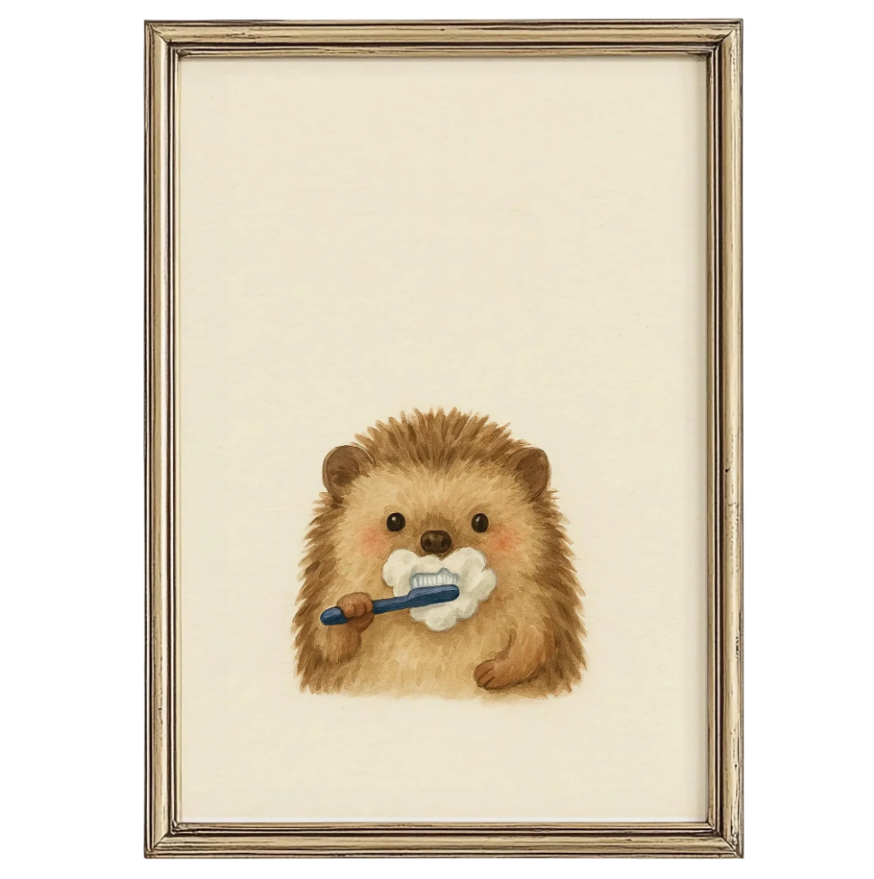 Motivul ariciului cu periuța de dinți este nu doar ușor de recunoscut, ci și amuzant și non-invaziv. Datorită acestui fapt, se potrivește în baie, dar și în alte spații unde doriți să adăugați un element decorativ simplu. Executarea fără ramă permite alegerea propriei metode de fixare sau completarea cu un cadru potrivit.