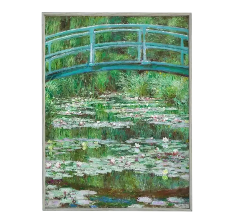 Aceast plakat pe perete aduce în interior frumusețea delicată a peisajului natural inspirat de pictura impresionistă. Motivul podului japonez deasupra unui iaz cu nuferi are un efect armonios și ajută la crearea unui mediu liniștit, potrivit pentru odihnă și relaxare zilnică. Orientarea verticală a imaginii este ideală pentru pereți mai îngusti sau pentru combinarea mai multor decorațiuni unul lângă altul. Imprimarea pe pânză cu o textură fină conferă decorației un aspect autentic și evidențiază tranzițiile de culoare caracteristice impresionismului. Produsul este livrat fără ramă, astfel încât să puteți adapta modul de instalare în funcție de stilul dumneavoastră de locuit.