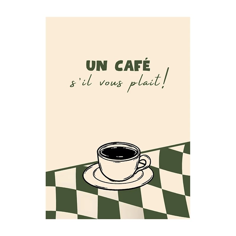 Plakat pe perete cu cană de cafea și text în franceză 20 × 30 cm print pe pânză bej verde decorare pentru apartament și cafenea fără ramă