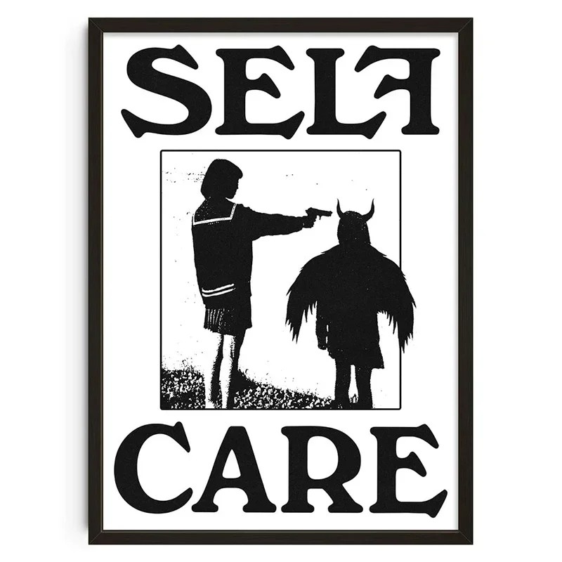 Plakát pe perete cu motivul self care aduce un mesaj vizual puternic într-o prezentare grafică simplă. Elementul dominant este ilustrația alb-negru contrastantă a figurilor, completată de un text expresiv, care formează partea principală a compoziției. Motivul este realizat într-un stil minimalist, ceea ce îi conferă claritate și se integrează ușor în diferite tipuri de interioare. Combinația de text și siluete creează un element vizual interesant, potrivit pentru un mediu cotidian.