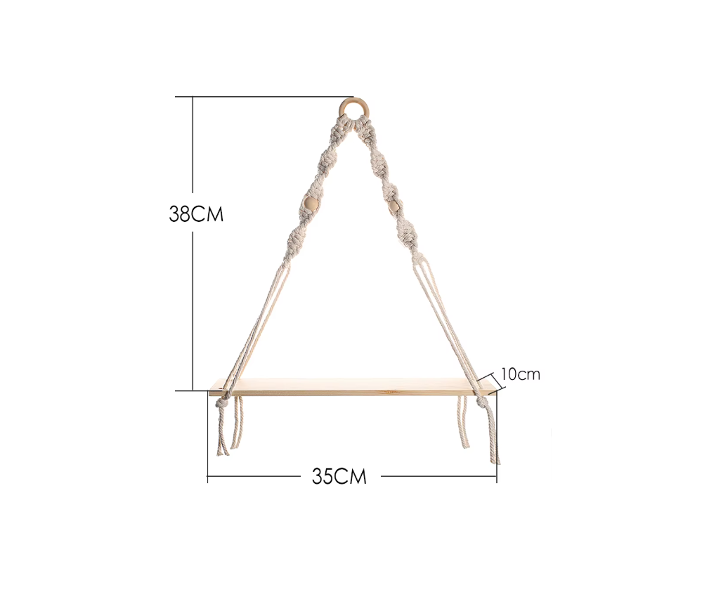 Poliță din lemn suspendată cu sfoară și mărgele, cu dimensiunile de 10 × 35 × 38 cm, ideală pentru expunerea decorațiunilor în stil boho. Descrierea completă
