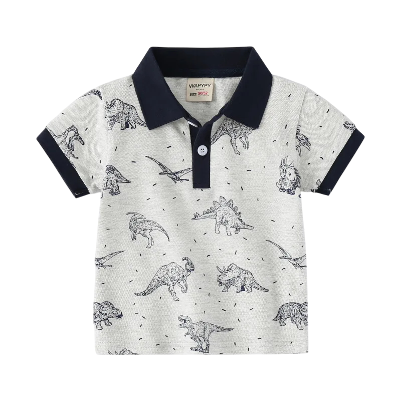 Această polo modernă pentru băieți, de culoare gri, cu motiv de dinozauri, îmbină confortul, calitatea și un stil jucăuș. Fabricată din bumbac 100% fin și respirabil, oferă o senzație plăcută chiar și în zilele călduroase. Datorită mâncilor scurte și gulerului cu nasturi până la jumătatea pieptului, are un aspect elegant și modern, dar rămâne în același timp practică și confortabilă pentru purtarea zilnică. Imprimarea originală cu dinozauri va încânta orice mic fan al creaturilor preistorice și va adăuga o notă personală ținutei.