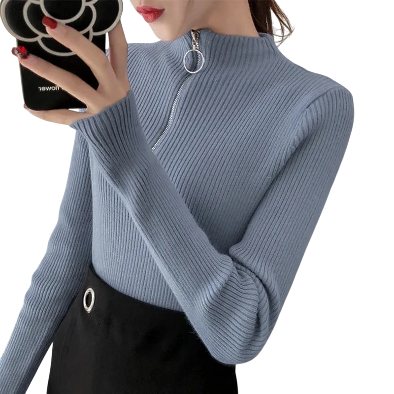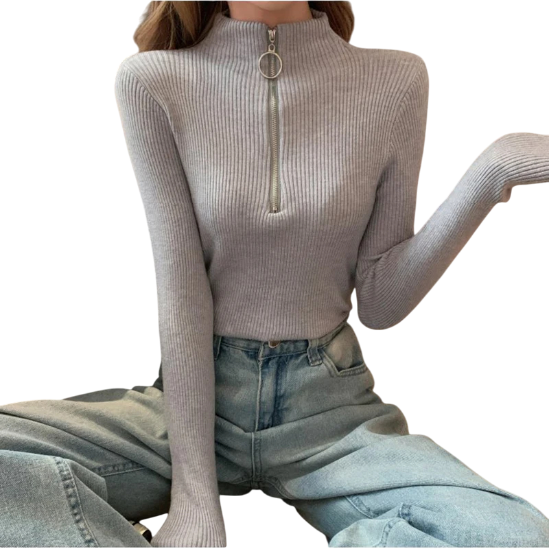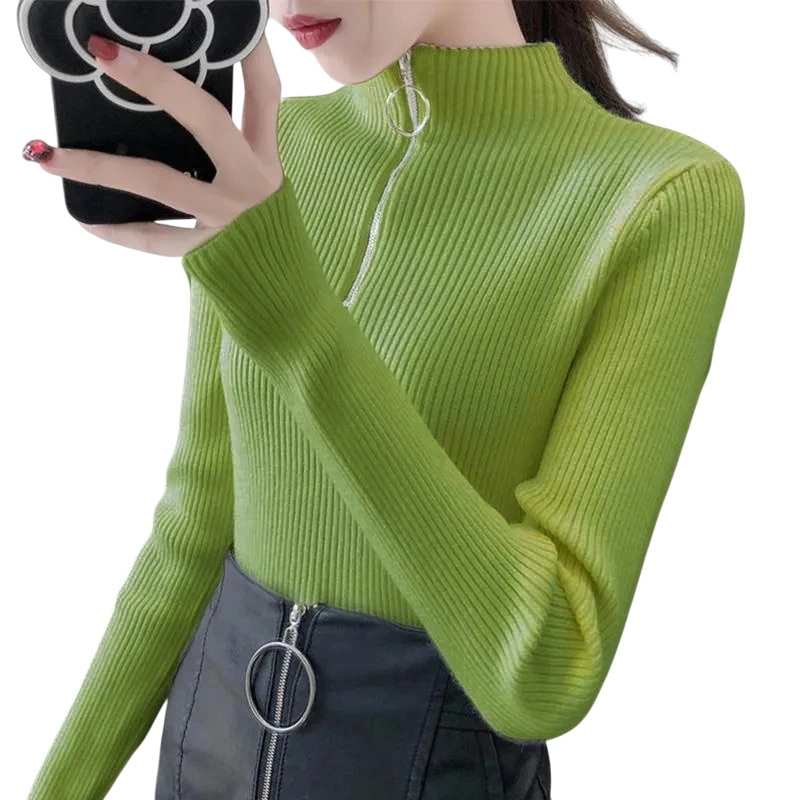 Pulover damă cu guler înalt și fermoar pe jumătate Pulover elegant într-o singură culoare din acril și bumbac cu mâneci lungi Top confortabil de iarnă în diverse culori