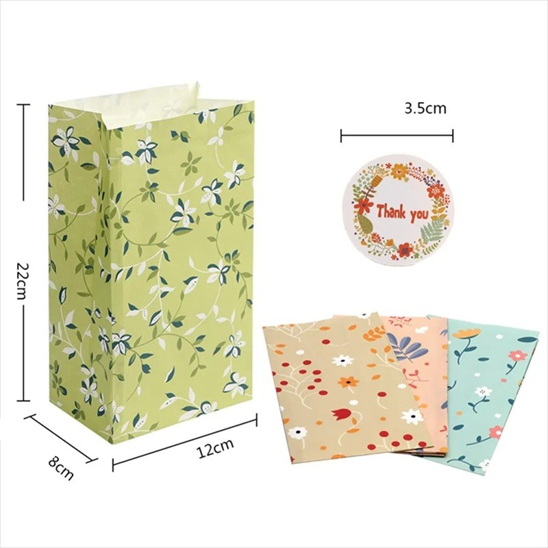 Pungi de hârtie pentru cadouri 24 buc 12 x 8 x 22 cm cu model vegetal Pungi Kraft pentru biscuiți și dulciuri cu autocolante de 3,5 cm