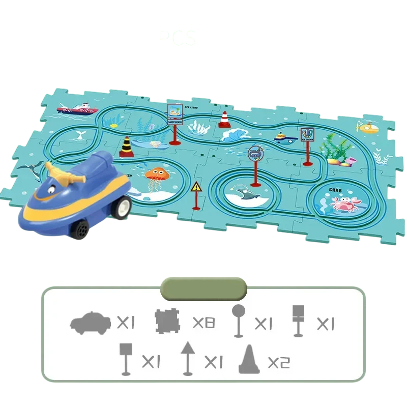 Tren electric pentru copii cu temă oceanică, 15 piese (1 mașinuță, 14 puzzle-uri). Jucărie excelentă pentru dezvoltarea motricității și creativității, ideală pentru copii mici. Descrierea completă