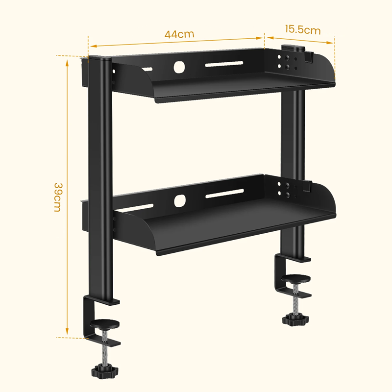 Raft negru cu 2 niveluri 44 x 39 x 15,5 cm din oțel carbon cu clemă pentru marginea mesei Organizator metalic pentru monitor, cărți și accesorii de birou