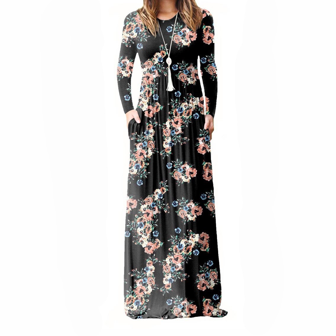 Rochie lungă cu mâneci lungi. Decolteu rotund elegant și buzunare practice.