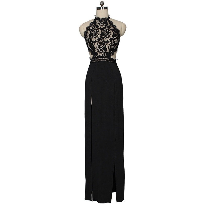 Aceasta este o rochie lungă pentru femei, cu un top din dantelă și o fantă înaltă.