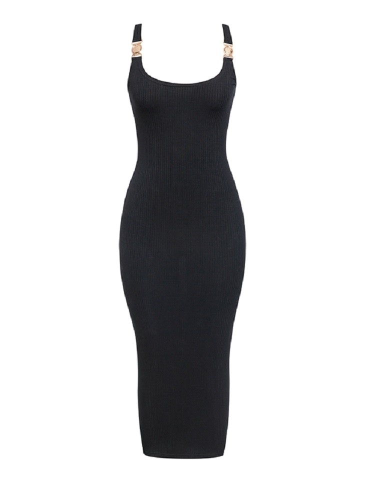 Rochie lungă tricotată de culoare solidă pe umerașe.