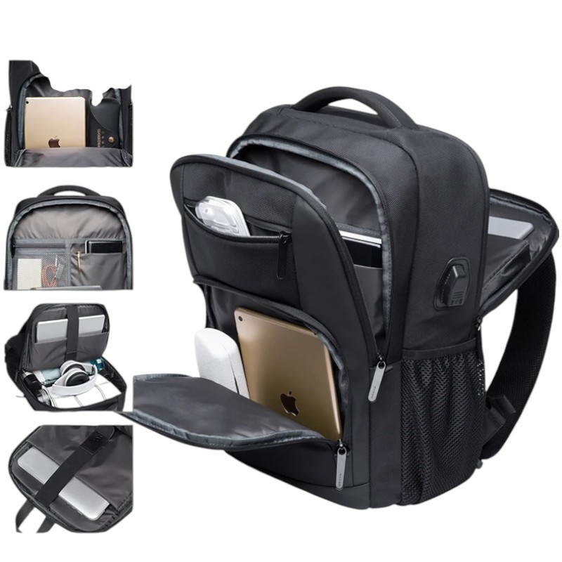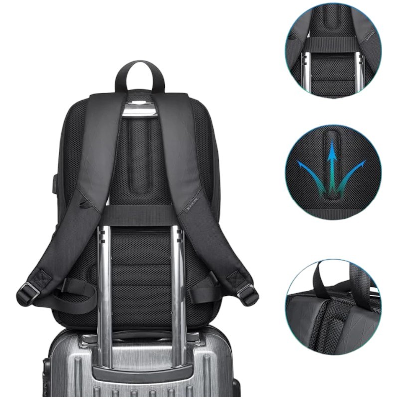 Avantajul principal este spațiul interior de capacitate mare, care poate găzdui laptopul, documentele și alte accesorii. Compartimentul căptușit separat protejează electronicele de șocuri și vibrații. Rucsacul este fabricat din material impermeabil, care ajută la protejarea conținutului de ploaie și umiditate. Portul USB de încărcare permite încărcarea confortabilă a dispozitivelor în timpul călătoriilor, folosind o baterie externă păstrată în interiorul rucsacului. Datorită mai multor buzunare, totul este organizat clar și ușor accesibil.