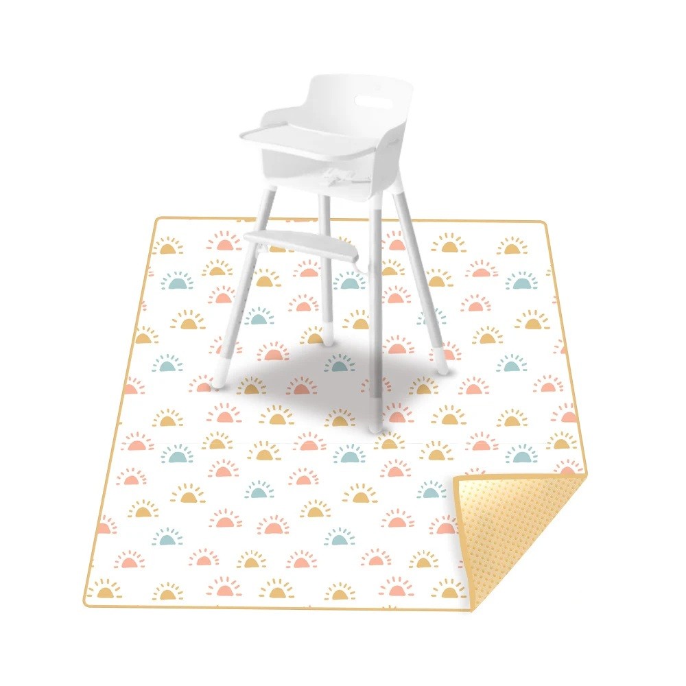 Această saltea pentru copii cu motiv de soare este practică și decorativă. Fundalul alb cu modele de soare pastelate în nuanțe de galben, roz și albastru conferă spațiului delicatețe și un aspect jucăuș. Este ideală sub scaunul de masă pentru copii, la masă sau în colțul de joacă. Fabricată din 100% poliester fără BPA, PVC și plumb – sigură, fără miros și ușor de curățat.