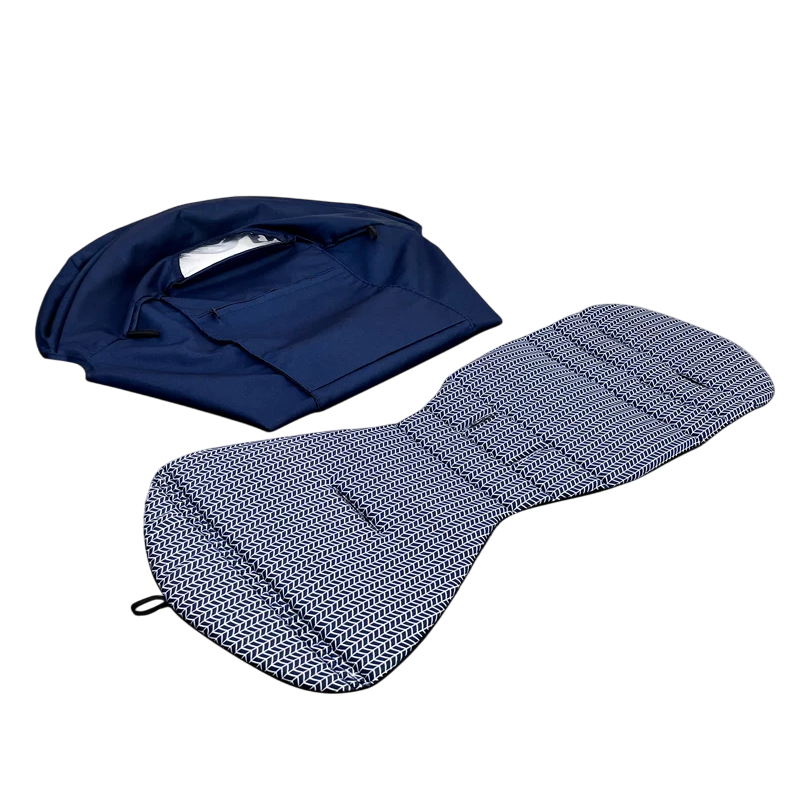 Saltea confortabilă și parasolar pentru Babyzen YOYO, ideală pentru vară. Design elegant albastru cu model alb, instalare și întreținere ușoară. Descrierea completă