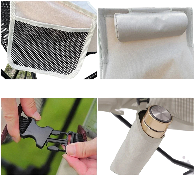 Scaun de camping pliabil portabil 42,7 x 57,4 x 104,3 cm cu suport pentru cap din aliaj de aluminiu, material cationic, suport pentru băuturi, montaj în 30 de secunde
