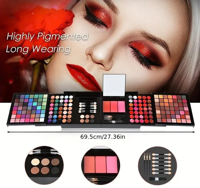 Set complet de machiaj cu 177 nuanțe de farduri de pleoape, blush-uri, luciu de buze și corectoare cu oglindă într-un ambalaj cadou practic. Descrierea completă