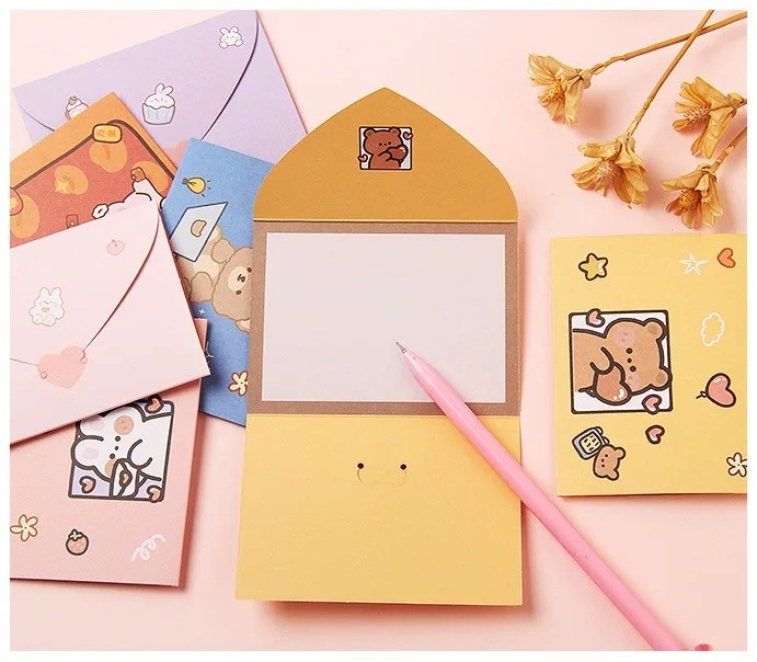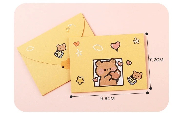 Pagina de start Pagina de start Casă Furnituri de birou Set de 10 bucăți de plicuri galbene cu hârtie 9,6 × 7,2 cm cu motiv de ursuleț cu inimioară