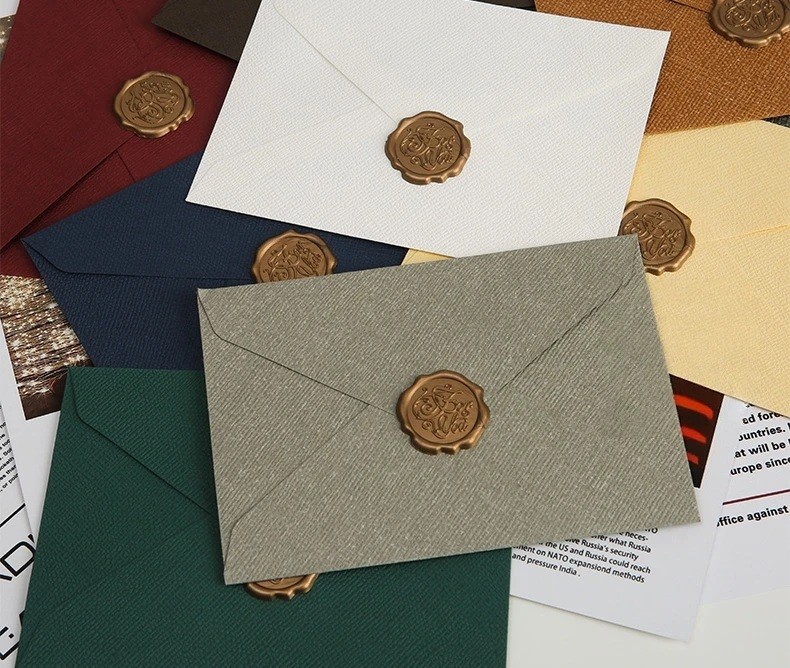 Plicurile sunt fabricate din hârtie structurată, care la atingere oferă o senzație de calitate și rezistență. Sigiliul stilat pentru închidere adaugă un aer de eleganță și originalitate aspectului general.