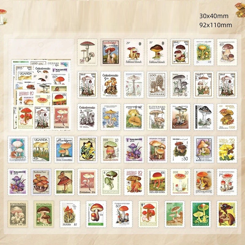 Set de 50 de autocolante în formă de timbre cu motive de ciuperci. Ideal pentru decorațiuni, felicitări și personalizarea diferitelor obiecte. Descrierea completă