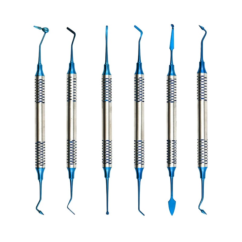 Set profesional de instrumente metalice cu mâner robust și cap acoperit cu titan pentru aplicarea precisă a umpluturilor dentare și rășinilor. Descrierea completă