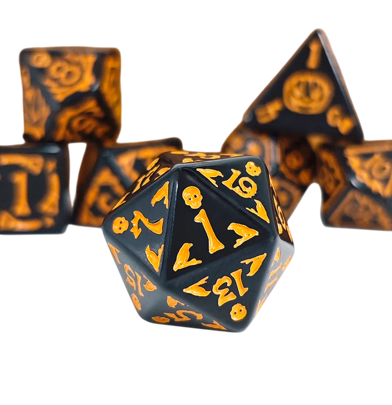 Această set de șapte zaruri este concepută pentru toți fanii jocurilor de masă, RPG și jocurilor de rol, care doresc să aducă o atmosferă distinctă de Halloween în sesiunile lor de joc. Zarurile negre cu decoratiuni portocalii contrastante atrag imediat atenția și completează perfect lumi fantastice întunecate și povești de groază. Setul conține un spectru complet de zaruri necesare pentru a juca jocuri de tip Dungeons & Dragons, jocuri de rol și alte jocuri de societate. Designul zarurilor sprijină imersiunea în joc și ajută la crearea unei identități vizuale unitare pentru masa de joc. Zarurile sunt potrivite atât pentru jocuri ocazionale, cât și pentru campanii de joc regulate.